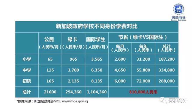 除了讓孩子更有保障地入讀小一或按照年齡直接插班政府學校外,持有新加坡綠卡身份,在學費上爲家庭的節余也不可小觑。新加坡政府學校的學費與國際學校差距大,大約是國際學校學費的1/7~1/5,新加坡教育部網站(www.moe.gov.sg)的數據顯示,綠卡/公民身份的學生從小學培養到大學,與外國學生的學費差額高達70-80萬人民幣左右,如果是有兩個孩子的家庭呢?有三個孩子的中國高淨值家庭也不在少數。