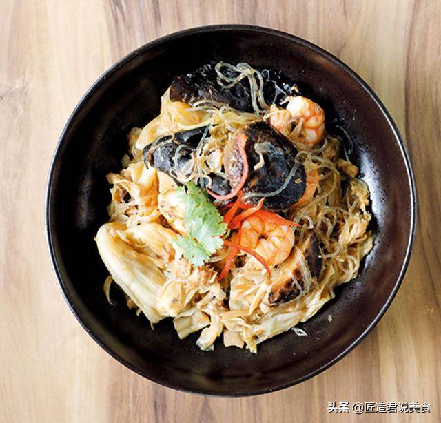 豬肉、粉絲和雜菜、甜豆幹、蝦仁都分別處理,再以蝦湯煮過,跟南乳粗齋有點相似,只是多了一點蝦味。每件食材都味道不一,而不是全部炒爲一碟就算了。