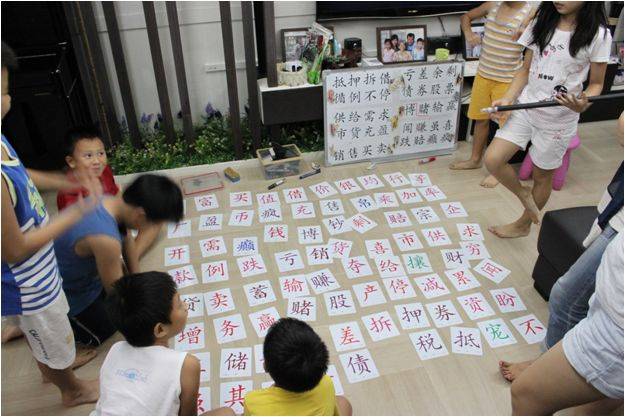 (爲了讓孩子對華文感興趣,Vivien邀請鄰居的孩子一起做識字遊戲)