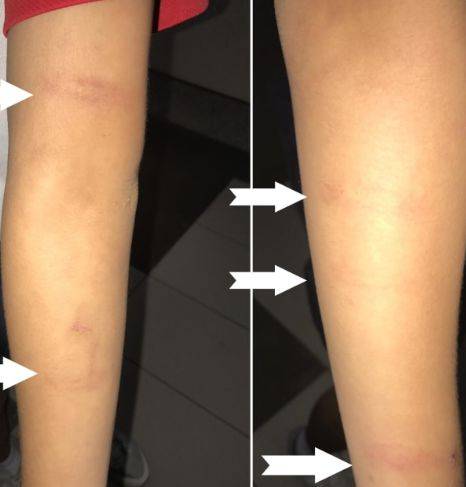 “我覺得訓導主任沒有給我們心理准備,要不然或許還有得談,當我們發現的時候真的很生氣。”夫婦倆認爲訓導主任沒有預先通知家長,因此決定報警。照片顯示,孩子手臂上有些看似藤條的痕迹,而腳上的痕迹較清晰。