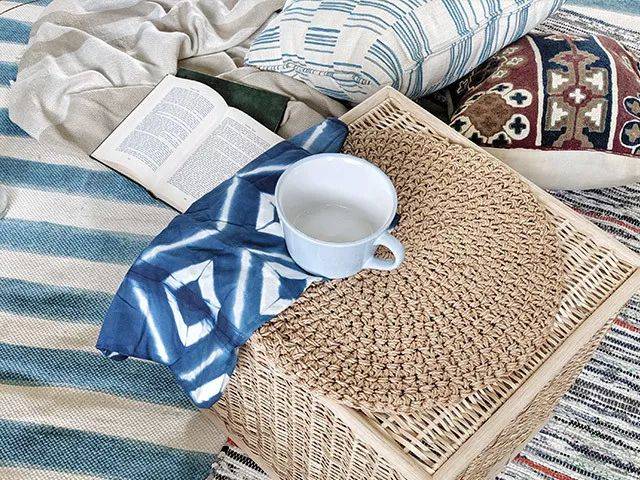想在宿舍招待朋友的話,可以將一個結實的藤條儲物籃翻過來,正好可以放一碗零食和幾個馬克杯。
