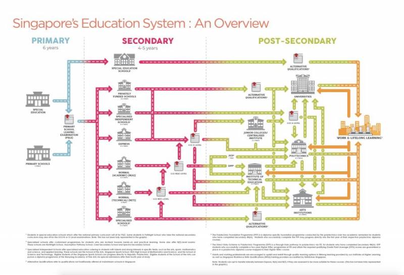 通過一項國家考試,國家考試包含:PSLE(小學六年級畢業會考),劍橋 N/O/A 水准,或者是進入IP計劃(Integrated Programme,允許中學表現優異的學生跳過O-Level 考試,直接進入JC(2年預科)學習O-level課程的計劃)