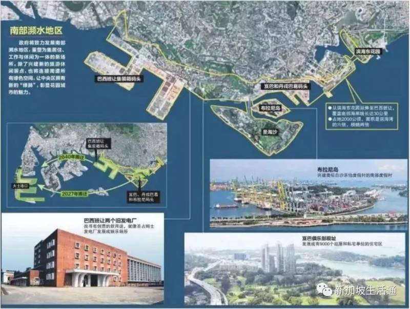新加坡南部瀕水地區包括丹戎巴葛碼頭、岌巴碼頭和布拉尼島碼頭以及巴西班讓碼頭。到了2027年,前三個碼頭將遷至大士,巴西班讓碼頭也將在2040年或之前搬遷到同個地點,這樣,黃金地段騰出空地供重新發展。