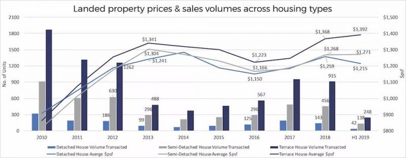 隨著整體私人住宅市場成交量的上升,有地房産的轉售成交量從2016年的987套飙升至2017年的1,653套。在2018年上半年,有地房産交易總量爲962套。然而,據蘇富比的Han說,繼2018年7月推出了樓市降溫措施後,2018年下半年的成交量暴跌至551套,而2019年上半年則爲431套。