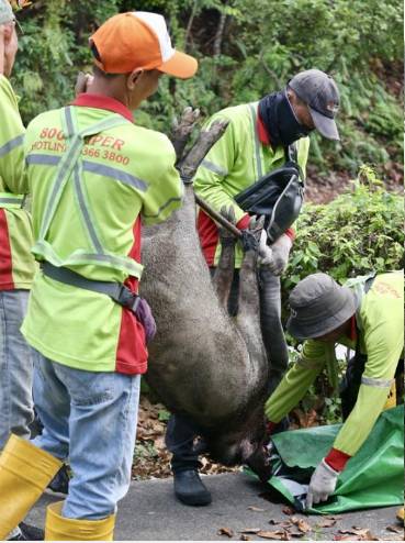 同月24日晚上8時許,在武吉巴督西5道和碧蘭路一帶,有一只母野豬從附近叢林沖到馬路上,慘遭一輛羅厘撞倒。