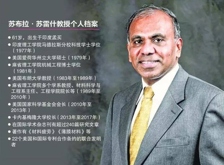 蘇雷什教授現年61歲。出生于印度孟買,現爲美國籍材料科學家。他擁有印度理工學院馬德拉斯分校一等榮譽學士、美國愛荷華州立大學碩士,以及在兩年內考獲麻省理工學院機械工程博士學位。