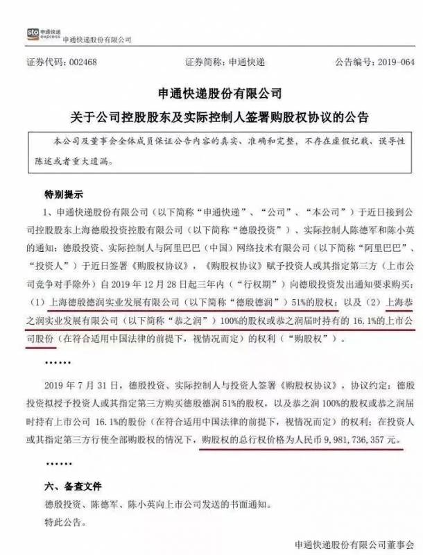 近日,申通公司與阿裏巴巴簽署了一份《購股權協議》,阿裏巴巴正式收購了申通31.35%的股份,約定收購價爲99.82億人民幣。