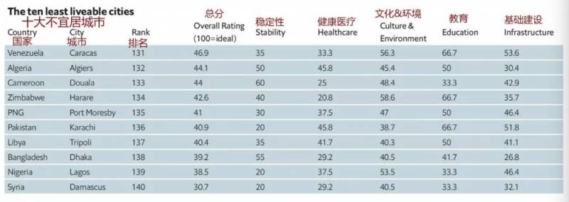 《2019年全球最宜居城市排名》的評比標准,是爲全球140個城市及國家在社會穩定、醫療衛生、文化與環境、教育及基礎設施方面打分,再根據總分排名。
