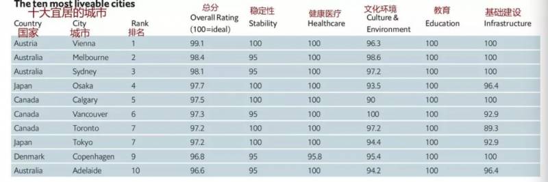 今年,仍然是奧地利的維也納占據榜首,成爲全球最宜居城市。加拿大和澳大利亞都有三個城市進入前十,日本大阪排名第三,是亞洲最宜居的城市。