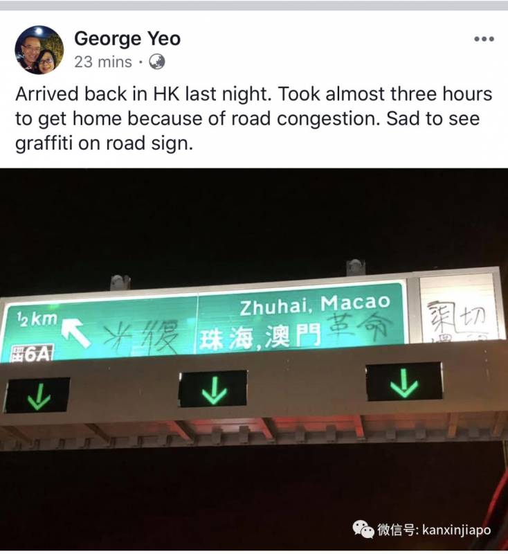 新加坡前外交部長楊榮文9月2日中午在Facebook發帖,說“昨晚回到香港,因路上擁堵,花了三小時才回到家。見到路上指示牌被塗鴉,心中難過。”