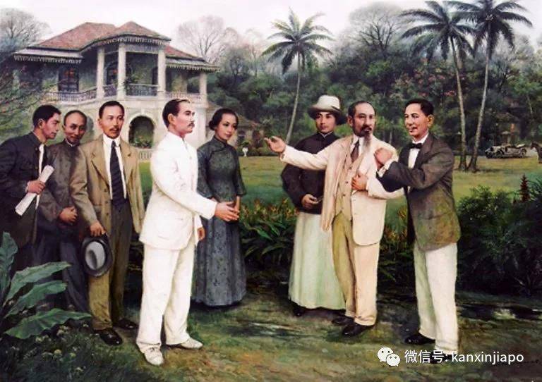 右二穿西裝蓄須者爲林文慶醫生,背景爲晚晴園,是同盟會南洋總支部,也是孫中山在南洋的革命基地,有三次起義就是在晚晴園策劃的。