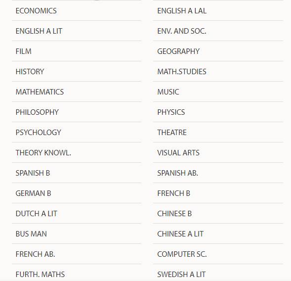 東陵國際學校的IB課程目前涵蓋了英語、數學、化學、生物、經濟、地理、物理、曆史、心理學等36個科目。具體IB科目如下: