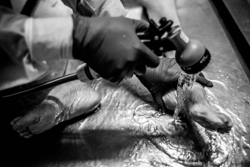吃完飯,她還未完成爲逝者的梳理工作。我站在門外,看著幾個年輕力壯的仵作,把一具具沒有生命氣息的軀體擡進入殓間,然後把整理好妝容、用白布包裹好的軀體擡出來,載送到停柩處。