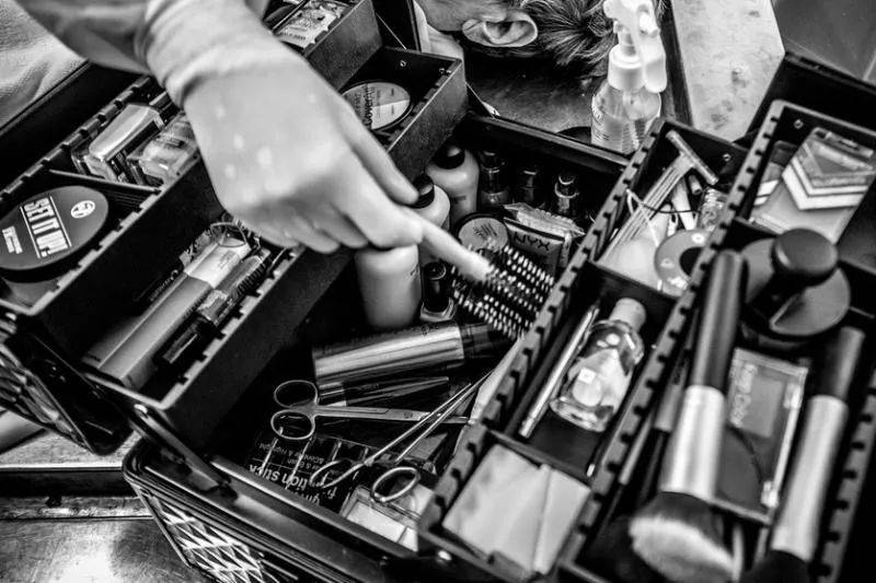 黑色的化妝箱裏的眉筆、眼影、腮紅、口紅等一應俱全。