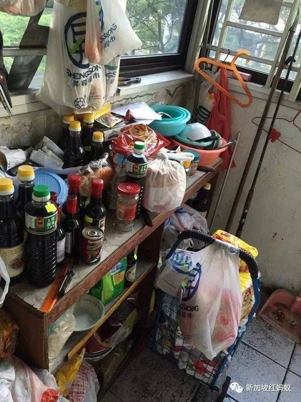 就是這樣恐怖:阿伯家裏的每一個櫃台上和櫃子裏都曬滿了調味料和罐頭食物,就連挂在窗口上的塑料袋也裝著醬油,擺在地上的推車也擠滿了快熟面。