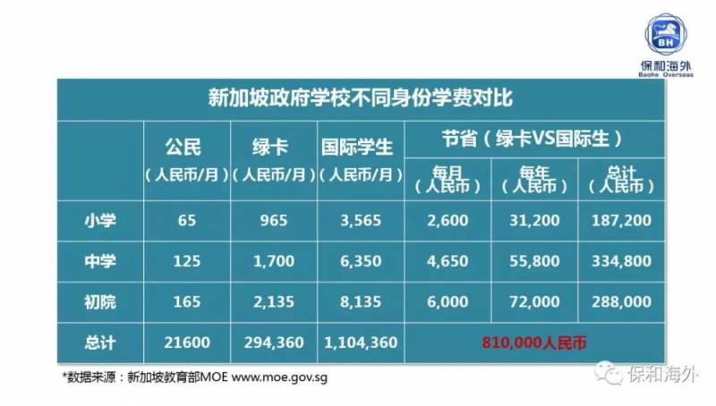 除了讓孩子更有保障地入讀小一或按照年齡直接插班政府學校外,持有新加坡綠卡身份,在學費上爲家庭的節余也不可小觑。新加坡政府學校的學費與國際學校差距大,大約是國際學校學費的1/7~1/5,新加坡教育部網站(www.moe.gov.sg)的數據顯示,綠卡/公民身份的學生從小學培養到大學,與外國學生的學費差額高達70-80萬人民幣左右,如果是有兩個孩子的家庭呢?有三個孩子的中國高淨值家庭也不在少數。