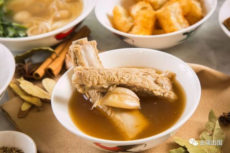 這道美食用藥材、大蒜和香料,加上豬肉骨烹煮而成,食用時配以米飯和辣椒黑醬油。它是大衆的早餐和夜宵。去新加坡,要想吃到原汁原味的肉骨茶,應該去唐人街牛車水的大排擋。茶客入座,店主便端上熱氣騰騰的大碗鮮湯,碗中有五六塊排骨,加一碗香噴噴的白米飯,還有一盤切成寸把長的油條,茶客根據各自口味,可加入胡椒粉、醋、鹽等調味品。吃完一大碗肉骨,接著是一小盅潮州的功夫茶,茶杯極小,泡的是很濃微帶苦味的普洱茶,而喝起來卻是滋味濃醇,馨香入肺。