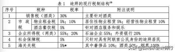 迪拜稅率的衆數是5%,除了石油企業所得稅實行55%的畸高稅率以外,基本比較溫和(具體的稅制結構參見表1)。