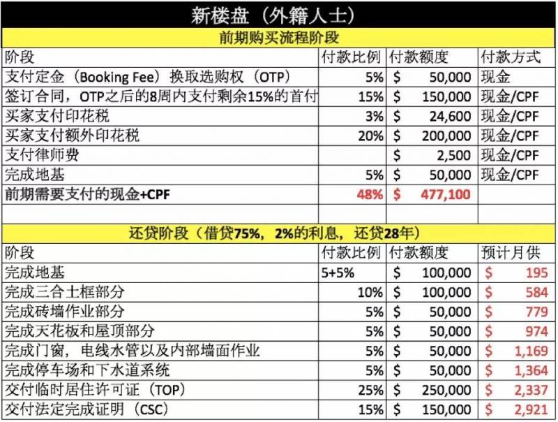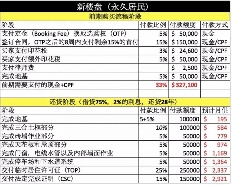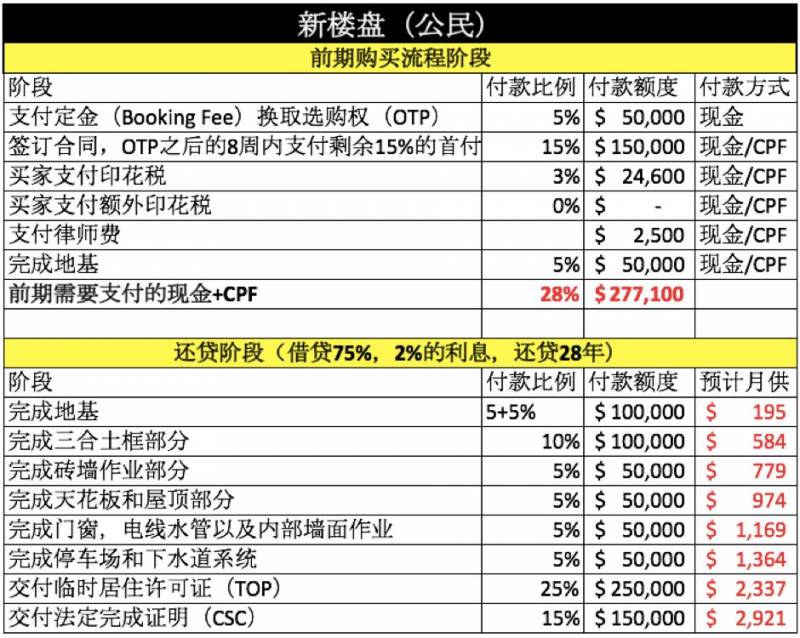 如上可知,$100萬的新公寓,前期需要准備的現金+CPF,針對公民,永久居民和外籍人士,分別是 $277,100, $327,100和 $477,100。月供從前期的$195遞增,項目完成後需要繳付的最終月供爲$2,921(預計)。
