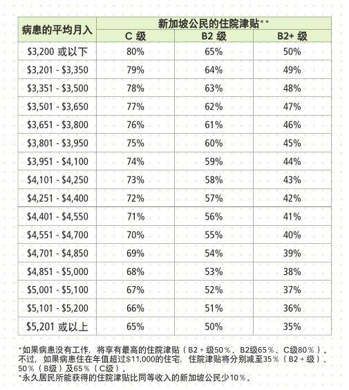 住院津貼:只有新加坡公民和永久居民有資格享有住院津貼。 非永久居民的外籍人士在接受醫療服務時是沒有津貼的,急診服務除外。入住B2及C級病房的住院津貼將根據病患的經濟能力而定。