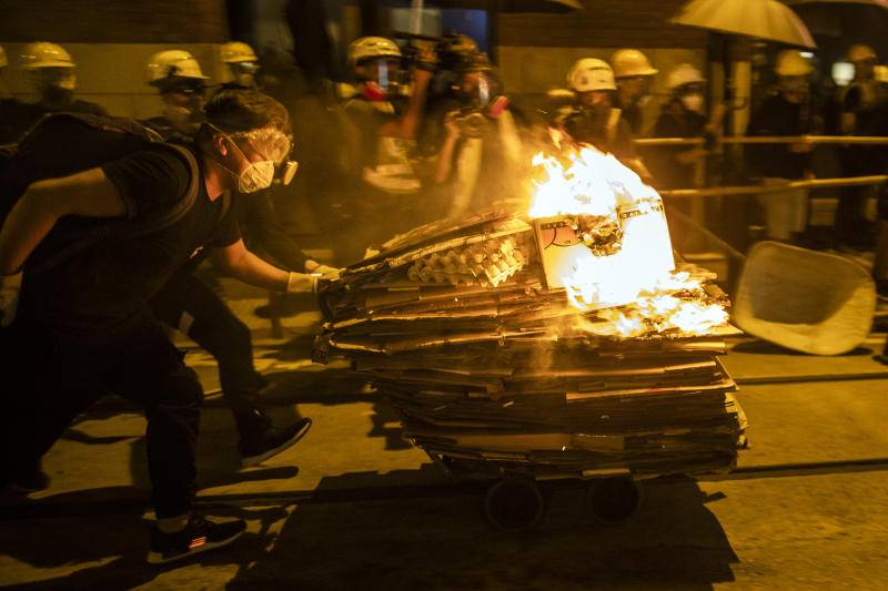 在7月28日香港上環的一場抗爭中,示威者自制“火焰沖車”撞向警隊防線。(彭博社)