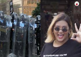 不是自由表達不好,但文明秩序的基礎確實很脆弱。左爲香港警察與示威港青對峙,右爲本地網紅普麗蒂(Preeti Nair,簡稱 Preetipls),她制作的視頻因帶有侮辱華人的內容而引發警方介入調查。(郭躍男制圖)
