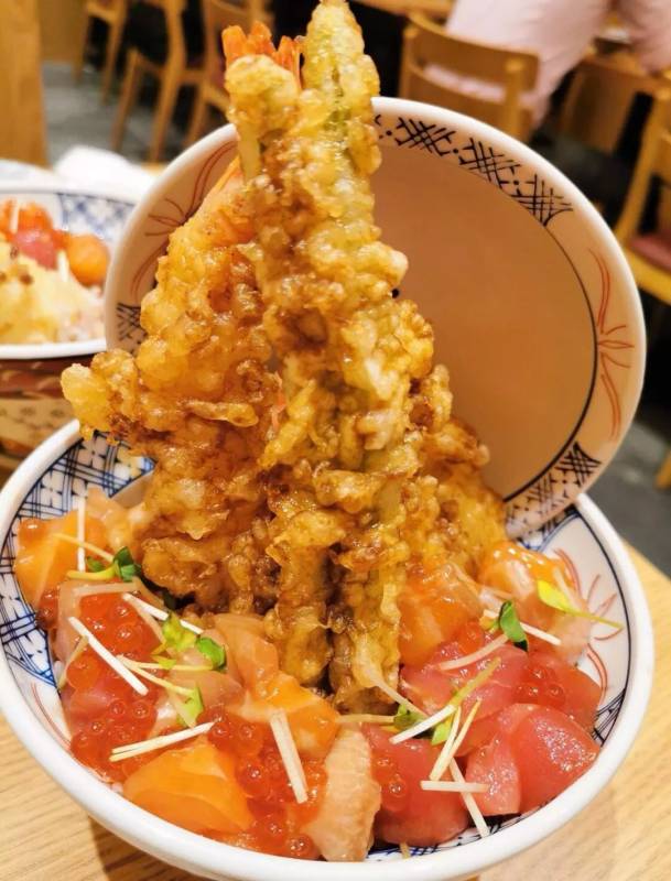 炸的酥脆的大個鳗魚天婦羅,搭配了生魚塊,撒上大量的北海道三文魚子,看著都開心。(S$26.5++)