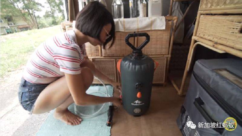 兩人的沖涼用具只是一個非常輕便的收縮盆,外加一個攜帶性淋浴筒,就讓他們在戶外也可以享受熱水澡的快感。