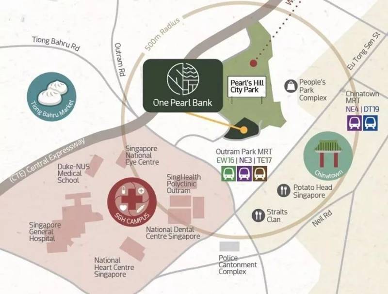 One Pearl Bank 的位置絕佳,步行約200米可到達歐南園地鐵轉換站(Outram Park MRT);2站就可達萊佛士坊地鐵轉換站(Raffles Place MRT),3站可達政府大廈地鐵轉換站(City Hall MRT)。
