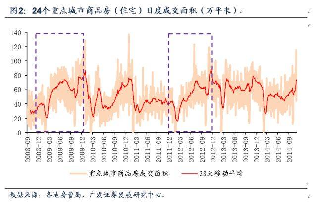 廣發證券研究中心當年選用24個重點城市日度成交數據來反映降息前後住房成交絕對量變化(數據來源是各個城市的房管局)。在2008年周期中,降息始于2008年9月,當時日均成交量大約在30萬平米,從9月份到12月份,成交量持續上升,2009年12月,日均成交量約爲85萬平米,即使是在行業傳統淡季的6-9月份,日均也有50-70萬平米。在2012年周期中,盡管降息是從2012年6月開始的,但從2011年12月開始,連續3次降准(2011年12月、2012年2月、2012年5月),因此,該輪周期的起點應該是2011年12月,在此之前,日均成交面積連續6個月徘徊在40萬平米左右,而降准開始後,成交量同樣是持續上揚,2012年 12月,日均成交量約爲80萬平米。以下是成交絕對量的情況,從相對量來看,降息對成交的影響效果更爲顯著,統計局的月度數據顯示,降息降准後,商品住宅銷售面積累計同比增速在短期內即由負轉正,並且轉正後增幅擴大至很高的水平。
