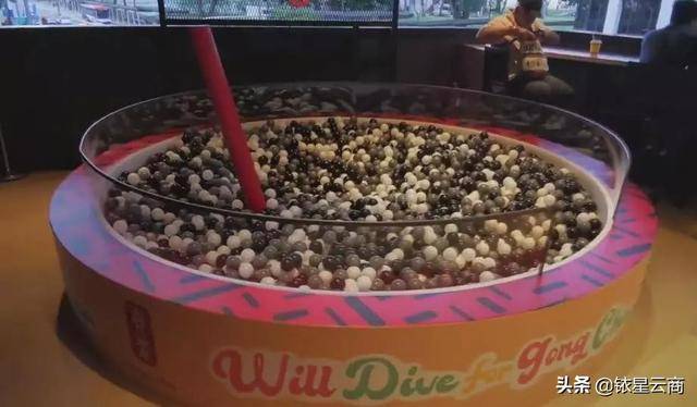 除了購物中心自身的設施外,許多商家也設置了可供消費者玩樂的設備,例如這個“巨星海洋球奶茶”,就是一個可以坐在裏面拍照打卡的小型記憶點。
