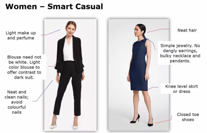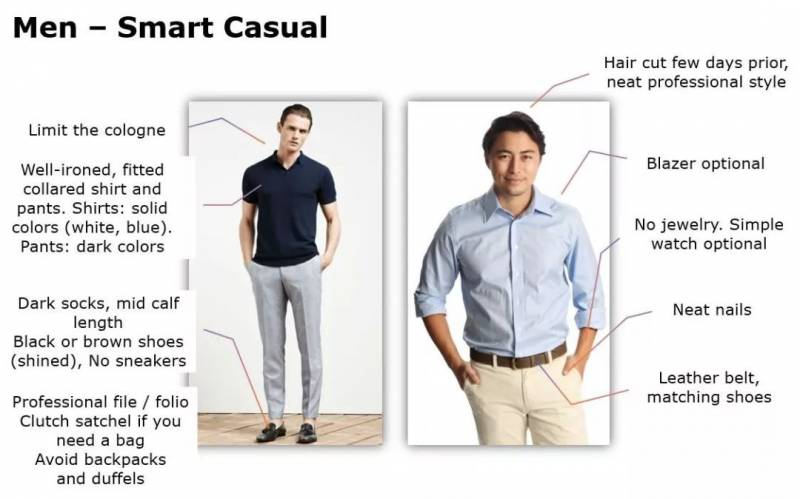 因此,大家一定不要忽視著裝細節,具體可以參考上面圖片中給出的提示。當然,有些穿著是禁止的,比如:有破洞/磨損的衣服、運動裝、短褲、牛仔褲、涼鞋、人字拖。