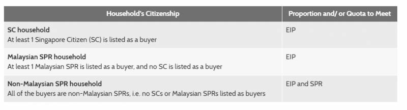 購買組屋需要滿足EIP和SPR配額。EIP指的是民族融合政策,同座組屋的非馬來西亞籍永久居民的比率不能超過8%。