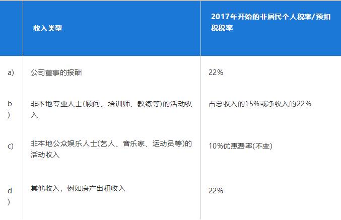 針對新加坡的稅務居民:個人所得稅實行新加坡個人所得稅實行累進稅率制,扣除免稅額度和許多減免項目之外,個人所得稅稅率保持在0-22%之間。