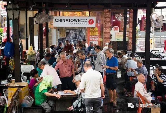 牛車水大廈的門口現已經成爲周邊華人休閑娛樂的首選場所,可以看很多閑聊品茶的中老年人,也有一些老年人在這裏比拼棋藝。