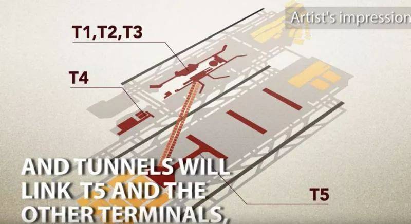 此外,由于T5和其他航站樓相隔較遠,爲了方便乘客,T5還會建造連接所有航站樓的sky trains。