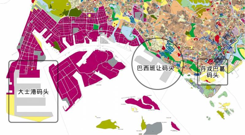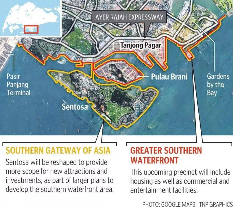 新加坡南部瀕水地區包括丹戎巴葛碼頭、岌巴碼頭和布拉尼島碼頭以及巴西班讓碼頭。到了2027年,前三個碼頭將遷至大士,巴西班讓碼頭也將在2040年或之前搬遷到同個地點,這樣,黃金地段騰出空地供重新發展。