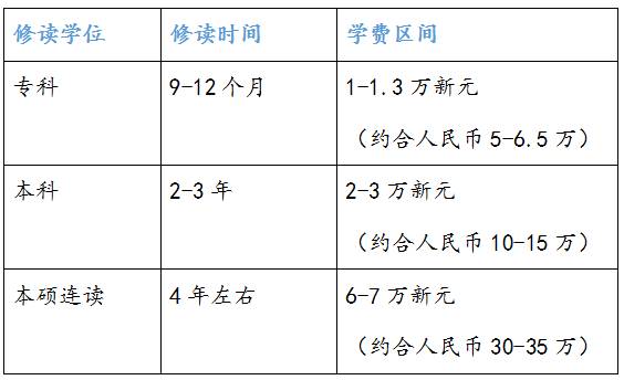 大專課程(9-12個月)總共只要1萬至1.3萬新幣左右,約合人民幣5-6.5萬。而在這邊就讀本科和研究生課程,學費只有在澳洲或者英國本部就讀學費的一半!