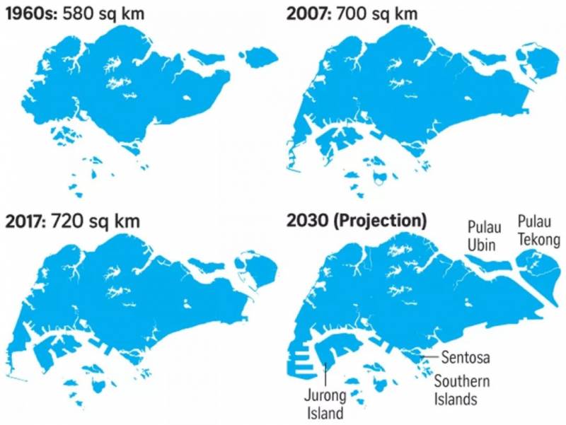 國土增長的背後,是雄心勃勃的填海造陸計劃。這一計劃可以追溯至1822年新加坡通商之初,而且仍在繼續,官方目標是在2030年達到766 km²,也就是又多出一個澳門。