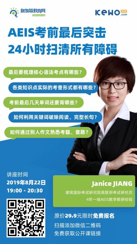 新加坡教育部(MOE)官網正式對外公布2019年AEIS考試定于2019年9月17日、18日和19日舉行,報名時間將于7月開始,教育部也將于7月公布更多報名及考試詳情。