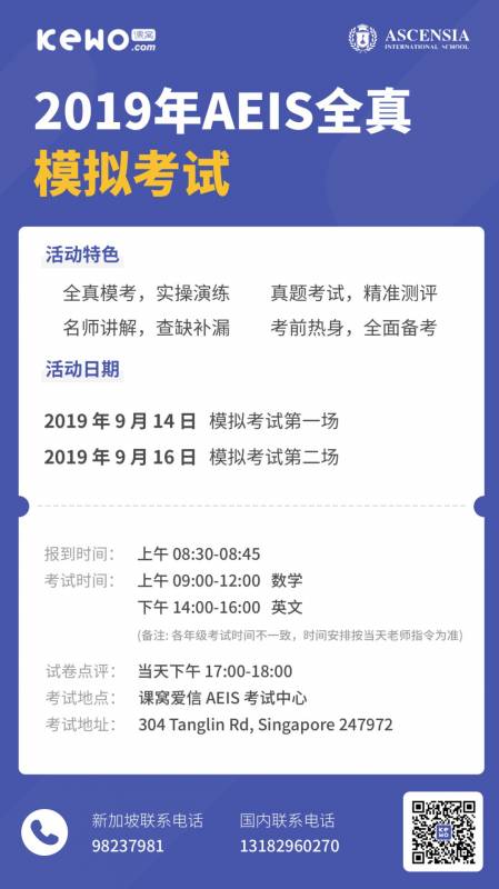 2019年度新加坡AEIS考試時間安排如下,先考中學後考小學,各位家長和同學准備好哦~而且廣大家長和同學注意的是,考試需要提前45分鍾到場!