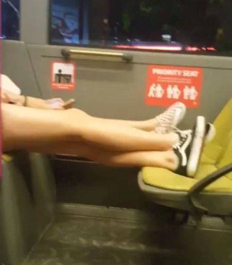 帖子中,巴士上驚現一張“新款”警示貼,警告乘客不要將腿踩在對面的座位上。