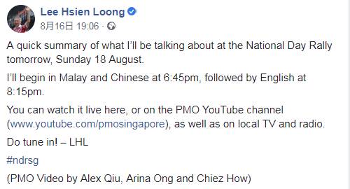 總理李顯龍在今日傍晚6時45分至7時30分以馬來語和華語演講,休息約45分鍾後,又于晚上8時15分至9時30分發表英語演講。