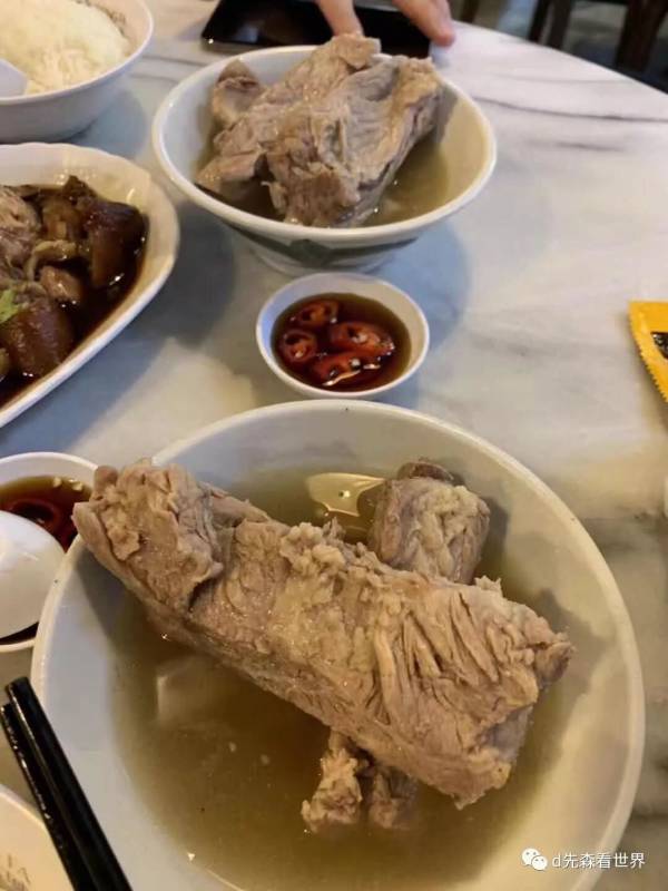 據說這是新加坡最正宗的肉骨茶。爲何叫肉骨茶呢?相傳華人初來南洋創業時,生活條件很差,由于不適應濕熱的氣候,不少人因此患上風濕病。爲了治病祛寒,先賢用了各種藥材,包括當歸、杞、黨參等來煮藥,但是,因忌諱而將藥稱爲“茶”。有一次,其中一人偶然將豬骨放入了“茶湯”裏,沒想到這(茶湯)喝起來十分香濃美味,風味獨特. 後來,人們特地調整煮茶的配料,經過不斷地改進,就成爲了本地著名的美食之一。