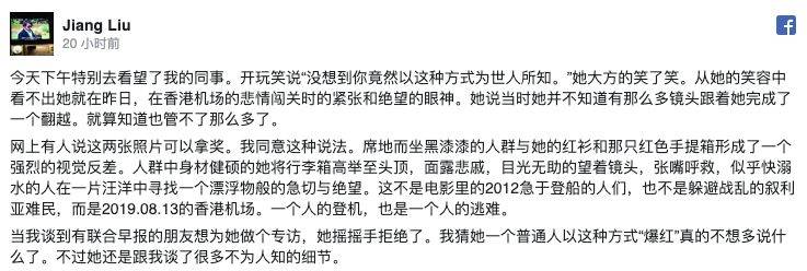 這張捕捉女子無助表情的照片凸顯當時香港機場混亂的情形,被多家國際媒體引用,也在社交媒體上也流傳開來,引起熱烈討論。有網民就留言說,“這張圖具曆史性”、“可以拿獎了”。