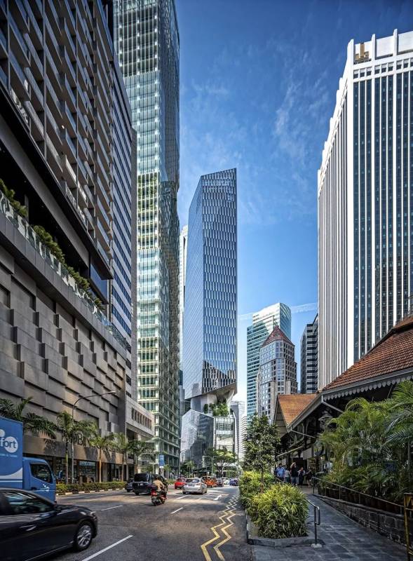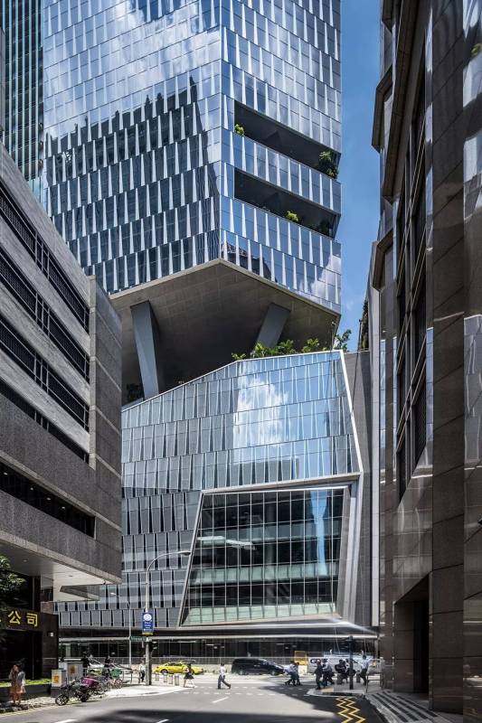 羅敏申大廈商業裙樓采用類似的晶體形態設計語言。設計中使用小尺度和帶圖案的材料,與新加坡中部曆史建築老巴刹食品市場有棱角的赤陶屋頂建立了一種語境聯系。裙樓體量略高于街面,增強連接地面入口到中庭花園之間空間的寬敞感與連續性。該中庭成爲辦公大堂、商業和餐飲空間交彙的中心,面朝羅賓遜路的落地窗則促進室內與街景之間的對話。