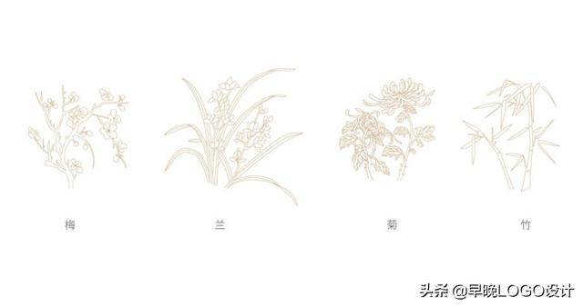 輔助圖形采用白描化的矢量插畫表現手法,選取了代表中國傳統文化中清雅淡泊的“梅蘭菊竹”,四種植物作爲繪畫主題,與此同時又與餐廳本身陳列的裝飾形成關聯,提高品牌的調性。