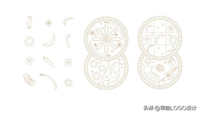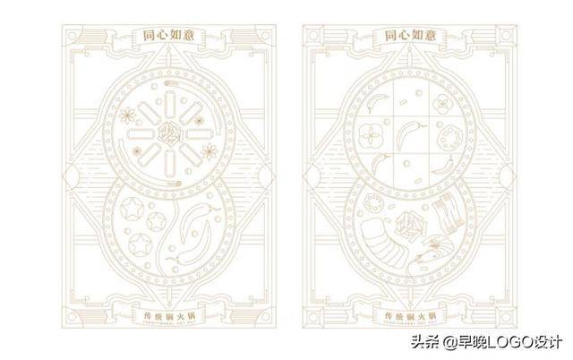 接著又從中式文化傳統紋樣中提取靈感,將火鍋的一些食材與象征火鍋的圖形相結合,把火鍋這種最大衆化的品類用極具設計感的形式呈現,雅致不失格調,文化也得到很好的體現。