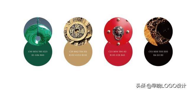 品牌主色調以深綠色和銅棕色爲主,分別從銅幣與代表吉祥之物的“如意”玉镯本身的色彩形成關聯,進一步強調了品牌的內涵及文化;輔助色則以朱紅色和墨黑色爲主,提取了代表有中國傳統文化元素的宮殿紅門與硯台。