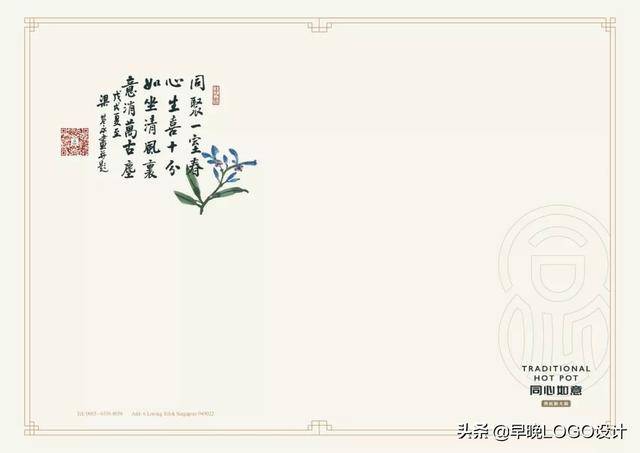 而在整個策略設計中,始終貫穿“同心”的文化內涵,讓LOGO設計成同心的符號icon,成爲品牌未來可以一直延續使用的“品牌資産”,從而使得産品與文化相統一。而設計上“軟實力”保留中式的傳統,比如輔助圖形梅竹蘭菊與中式傳統紋樣元素的提煉,形式上也更加簡化,更簡單快速地與消費者得到心靈上的溝通,這種“求同存異”的碰撞讓餐廳別有一番風味!